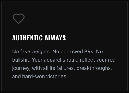 But when you walk into the gym the next day, nobody knows. Your shirt doesn't tell that story. It's just another generic fitness brand logo, mass-produced and meaningless.